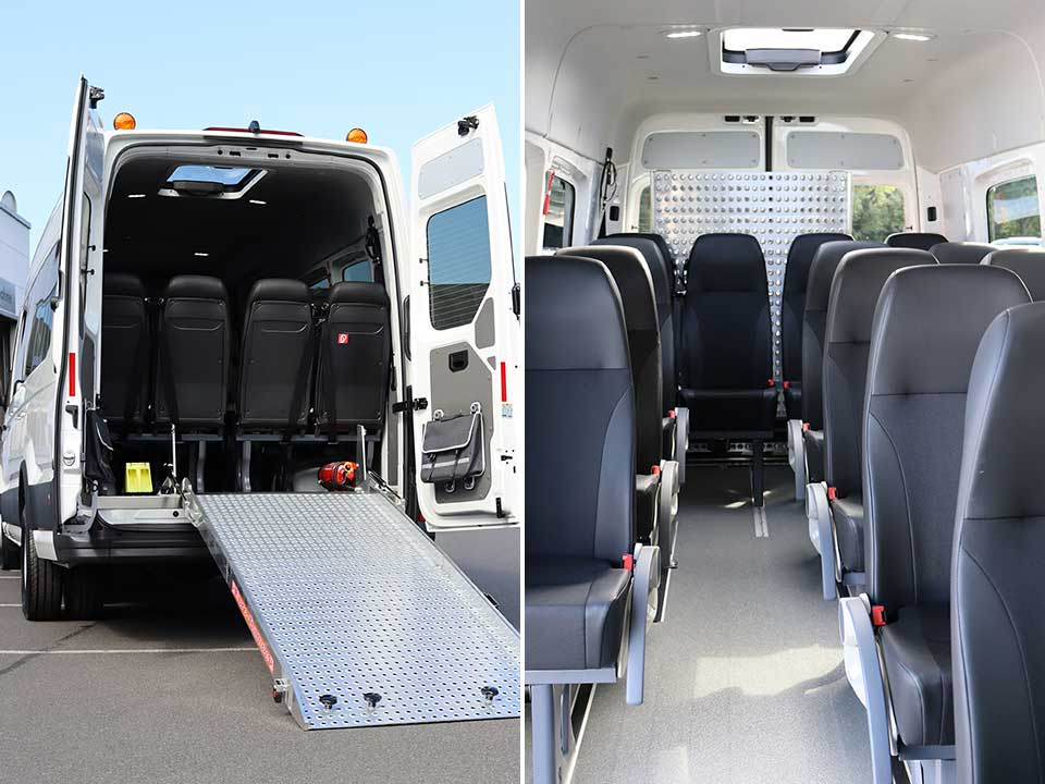 Der Crafter als Minibus – als Crafter 50 oder 55 mit bis zu 16 Sitzplätzen meistern Sie auch umfangreiche Personentransporte schnell und effizient. Durch den Einsatz von lichtdurchlässigen Dachluken erleben Ihre Fahrgäste ein luftiges Raumgefühl und kommen entspannt ans Ziel.