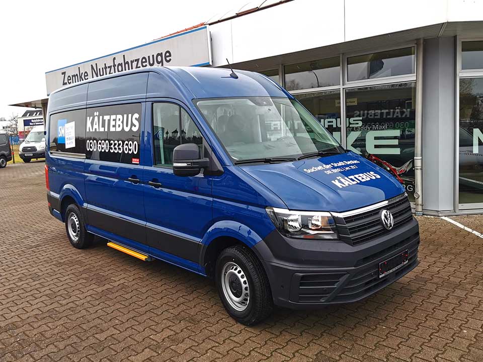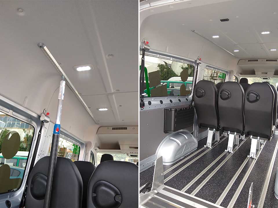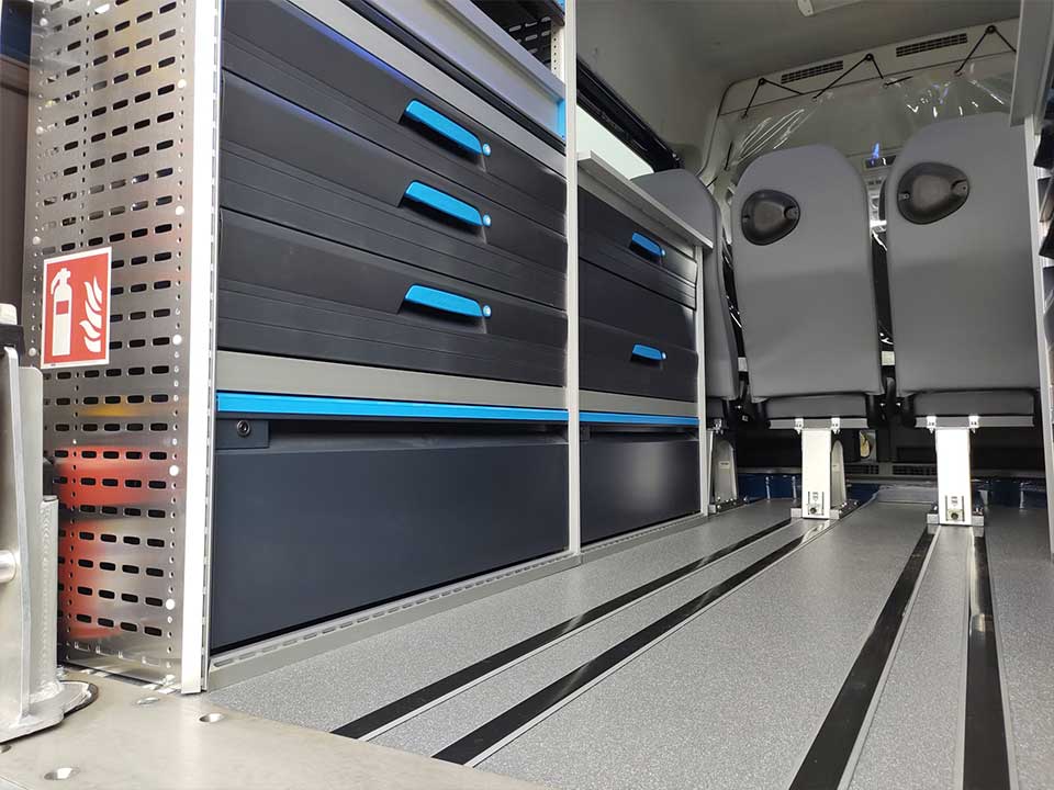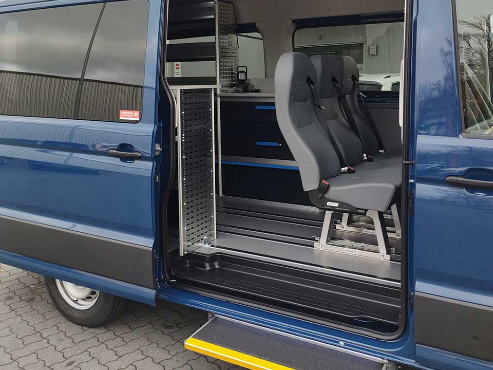 Zusätzlich zu den unterschiedlichen Sitzkonfigurationen ist auch der maßgeschneiderte Einbau von Regal- oder Schrankeinbauten Bestandteil unseres Portfolios – z.B. für den Kältebus der Berliner Stadtmission.